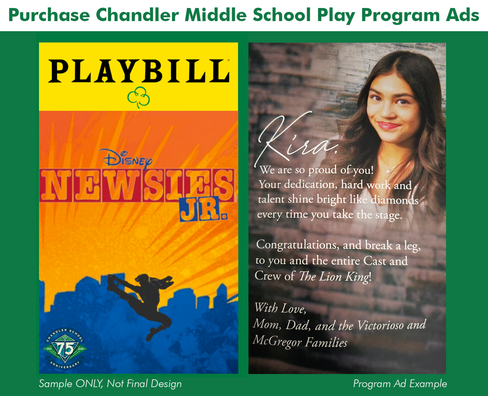 We are excited to offer families the opportunity to purchase a Playbill Ad or Dedication Page for our upcoming production of Disney’s Newsies Jr. In addition to each cast and crew member’s headshot and bio appearing in the production Playbill, families may choose to include a dedication or ad as a special way to celebrate their performer, recognize their hard work, and support Chandler’s Performing Arts Department.