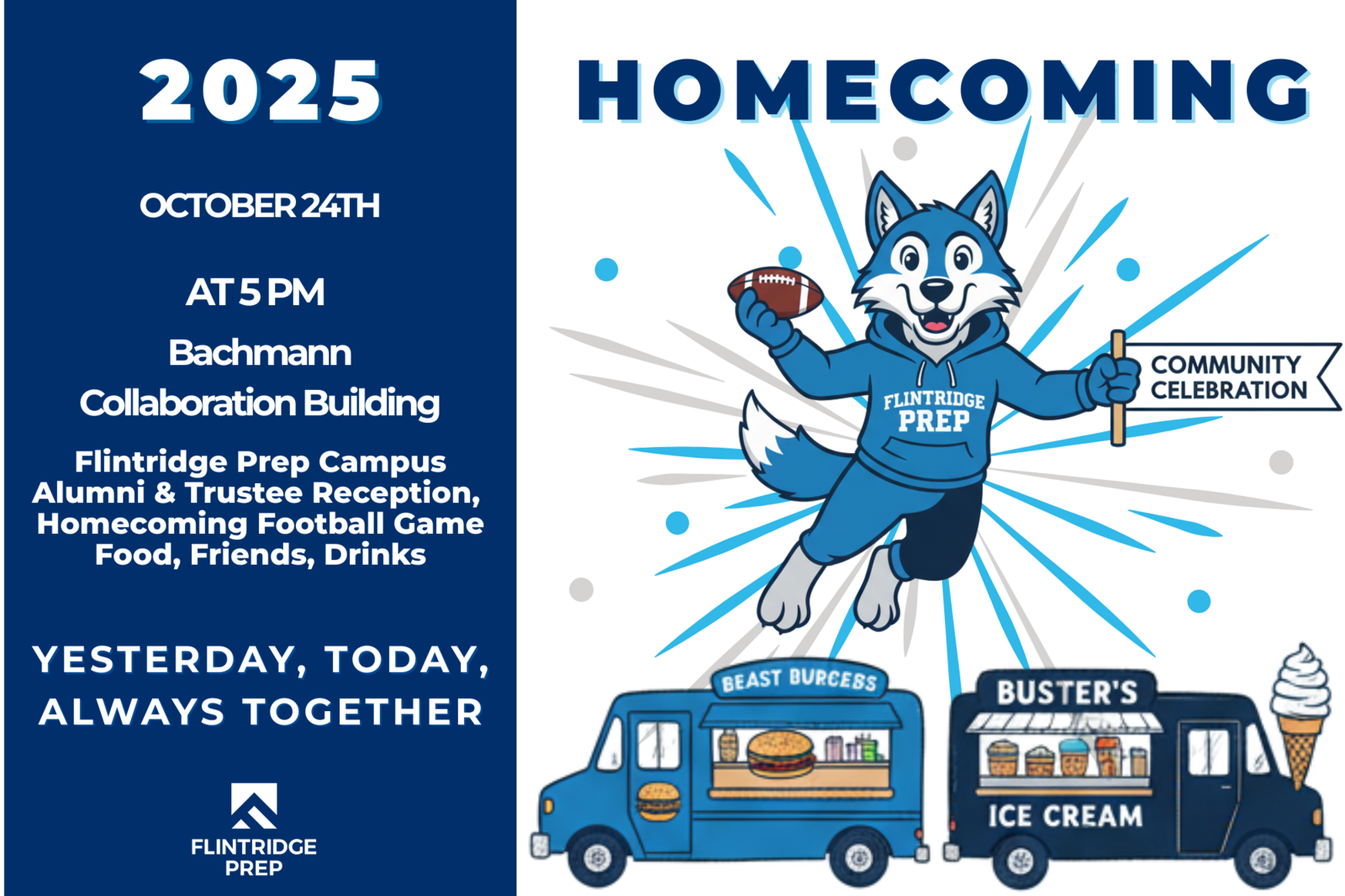 Welcome home, Alumni! We are excited to invite ALL Alumni to HOMECOMING this year! We are honoring the Class of 1976’s for their 50th reunion and the Class of 2001’s for their 25th reunion. We’ll also be recognizing our championship football legacy alumni with tributes to our CIF championship teams from 1989 and 2003. Don your BLUE and join us in cheering on the Flintridge Prep Wolves as they fight their way to the championships – let’s show up with true PREP PRIDE across the generations!