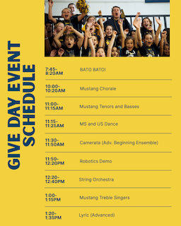 Join us on Give Day to enjoy the sights and sounds of student performing arts ensembles including Bato, Bato!, choirs, orchestras, and dance; view a Robotics Team demo; write thank you notes to donors; and view the Gratitude Walls in each of the three divisions.
