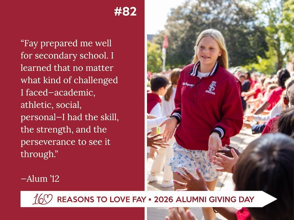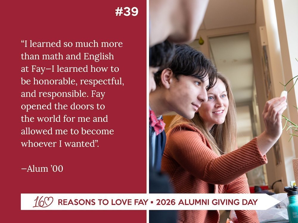 During this special 24-hour Alumni Family Giving Challenge, your gift celebrates the people, experiences, and traditions that have made Fay so meaningful to generations of families. Your support provides the essential foundation for the extraordinary education Fay students receive each day, empowering exceptional faculty, strengthening academic and co-curricular programs, expanding access through financial assistance, and maintaining and enhancing our beautiful, historic campus.