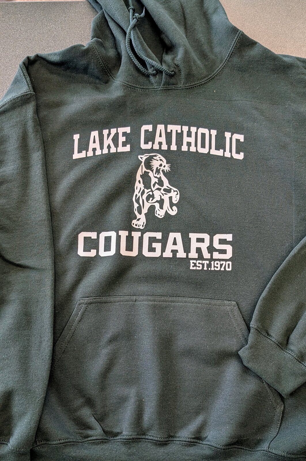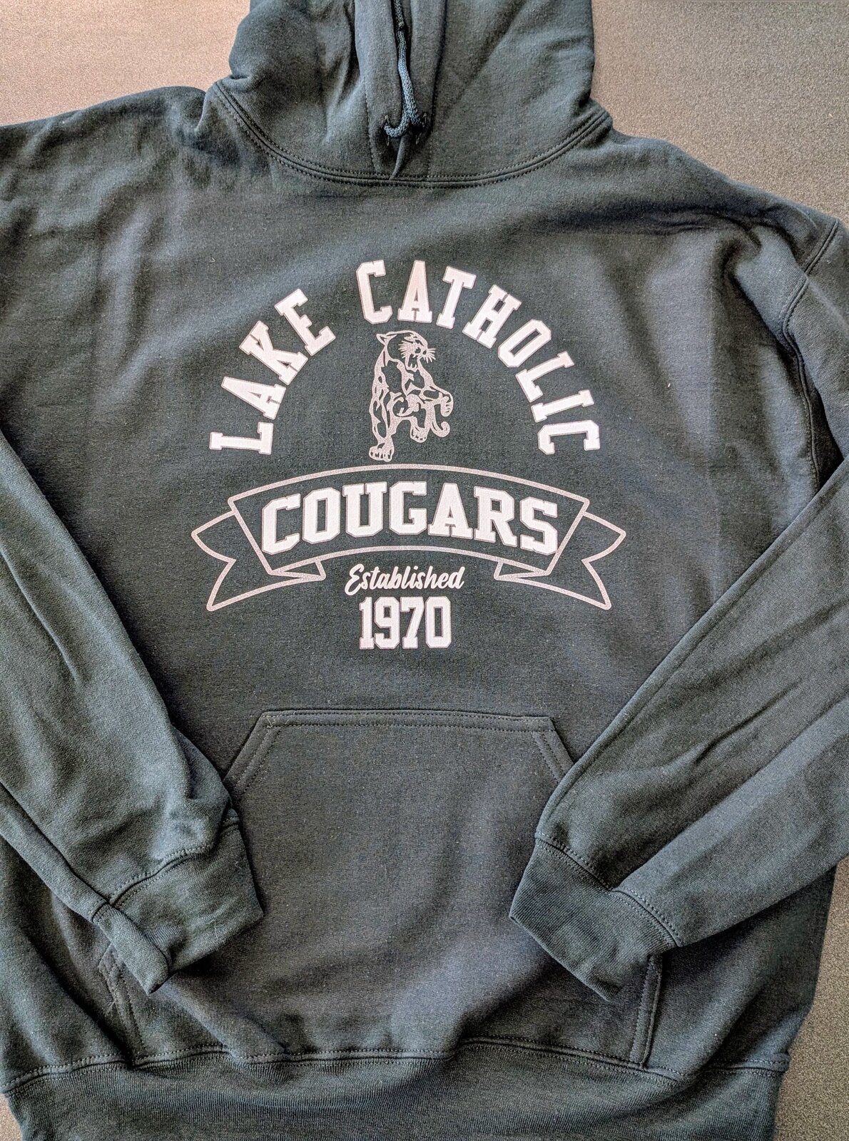 This black vintage Cougar hoodie features a nod to Lake Catholic’s founding year, 1970, giving you that perfect blend of retro style and school pride. Cozy and timeless.