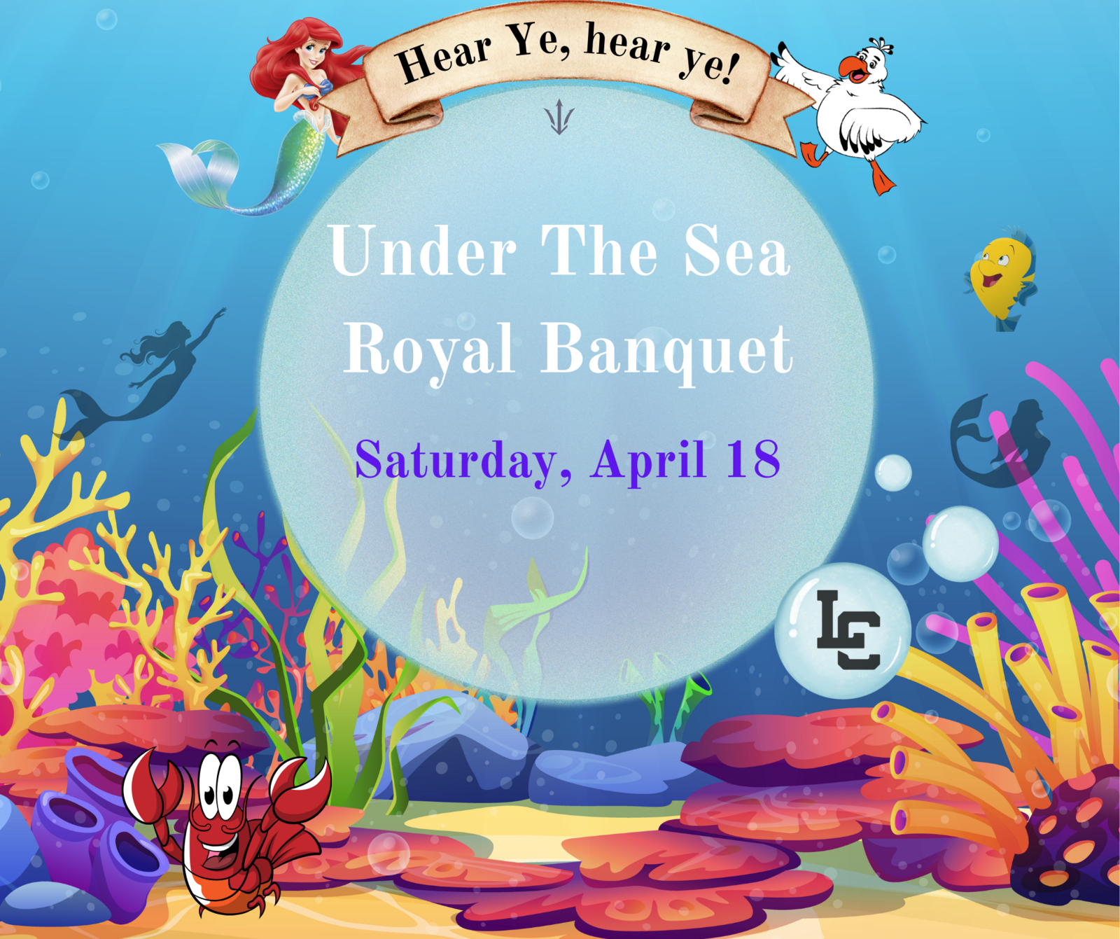 By order of King Triton, all Sea Princes and Princesses are cordially invited to a magical Under The Sea Royal Banquet filled with ocean delights, playful games, a royal character meet-and-greet, and a ticket to Lake Catholic’s production of Disney’s The Little Mermaid.