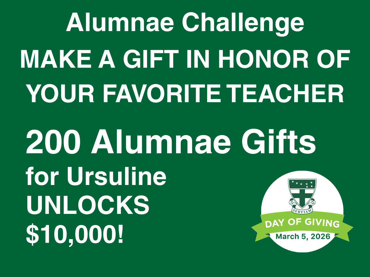 Calling all alums! Make a gift in honor of your favorite teacher! When we get 200, a group of fellow alums will add $10,000 to Ursuline’s total for the Day of Giving. Thank you!